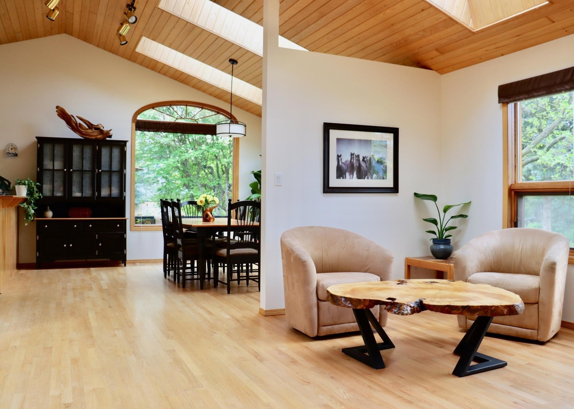 "Light, airy, spacious, with good flow" was the description our photographer gave of the home.  The inside of the home features a sitting area, or nook, a formal dining area, a kitchen dining area, seating around the kitchen peninsula, and a large patio door with convenient access to the expansive deck that includes access to the hot tub!